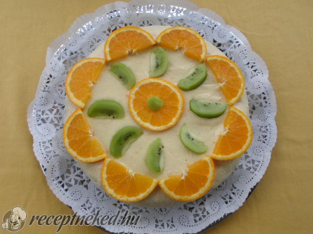 A kivit megpucoljuk, félbe vágjuk, majd a feleket felszeleteljük. A narancsot szintén félbevágjuk, majd felszeleteljük. A felszelt gyümölcsökkel kidíszítjük a tortát.