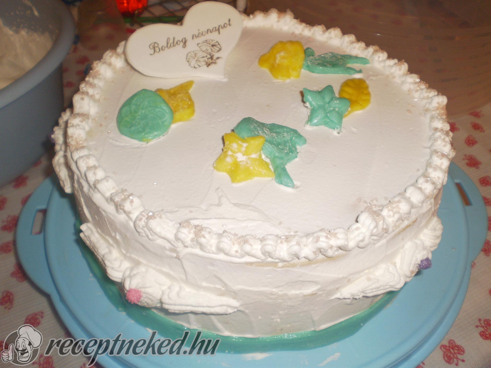 A maradék tejszínt keményre verjük és a torta oldalán és tetején elkenjük. Ízlés szerint díszítjük!