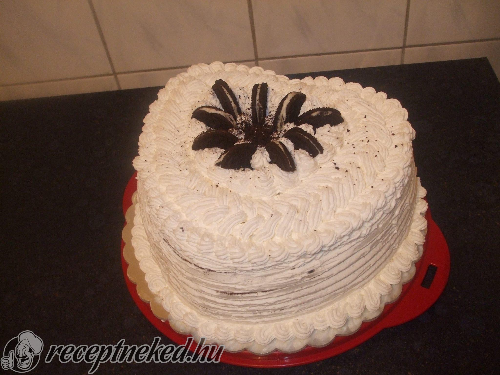 A maradék tejszínhabbal díszítjük a torta tetejét. A megmaradt oreo kekszet félbetörjük és ezekkel tovább díszítjük a tortát.