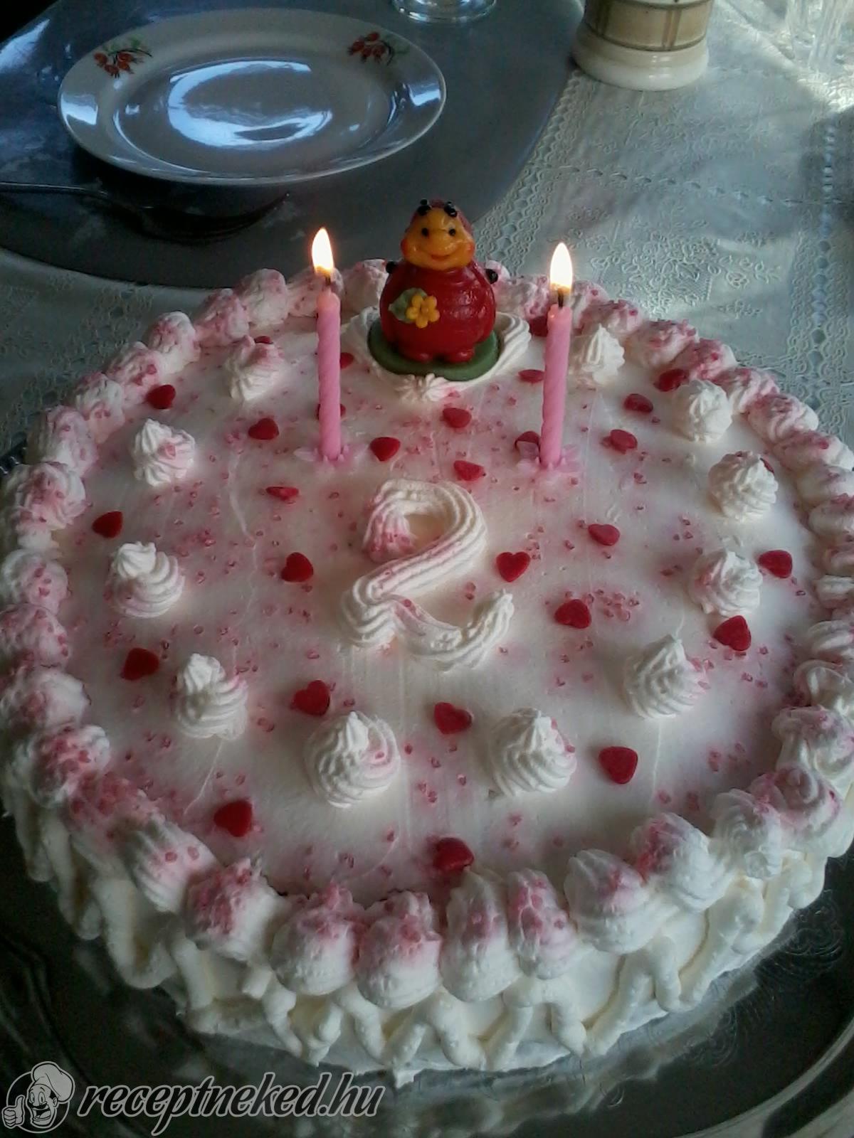 Mire kész a krémünk, a tortalap is kihűlt, vágjuk 3 lapra a tésztát és töltsük meg a lapokat a krémmel. A tortát a félrerakott, felvert habtejszínnel fedjük be és díszítsük.