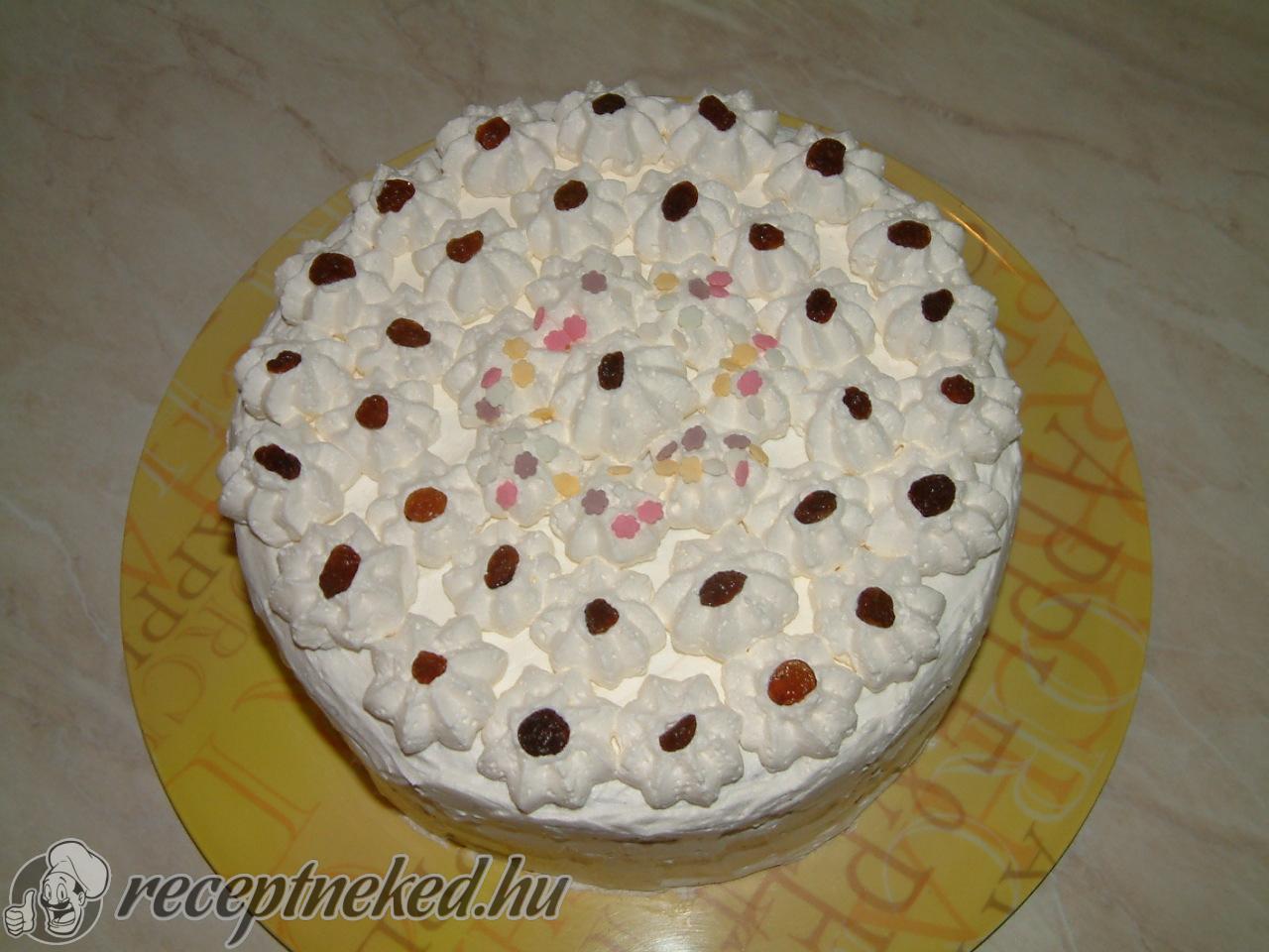 A tejszínt kemény habbá verjük, és bevonjuk vele a torta tetejét és oldalát. A maradék habbal ízlés szerint díszítjük.