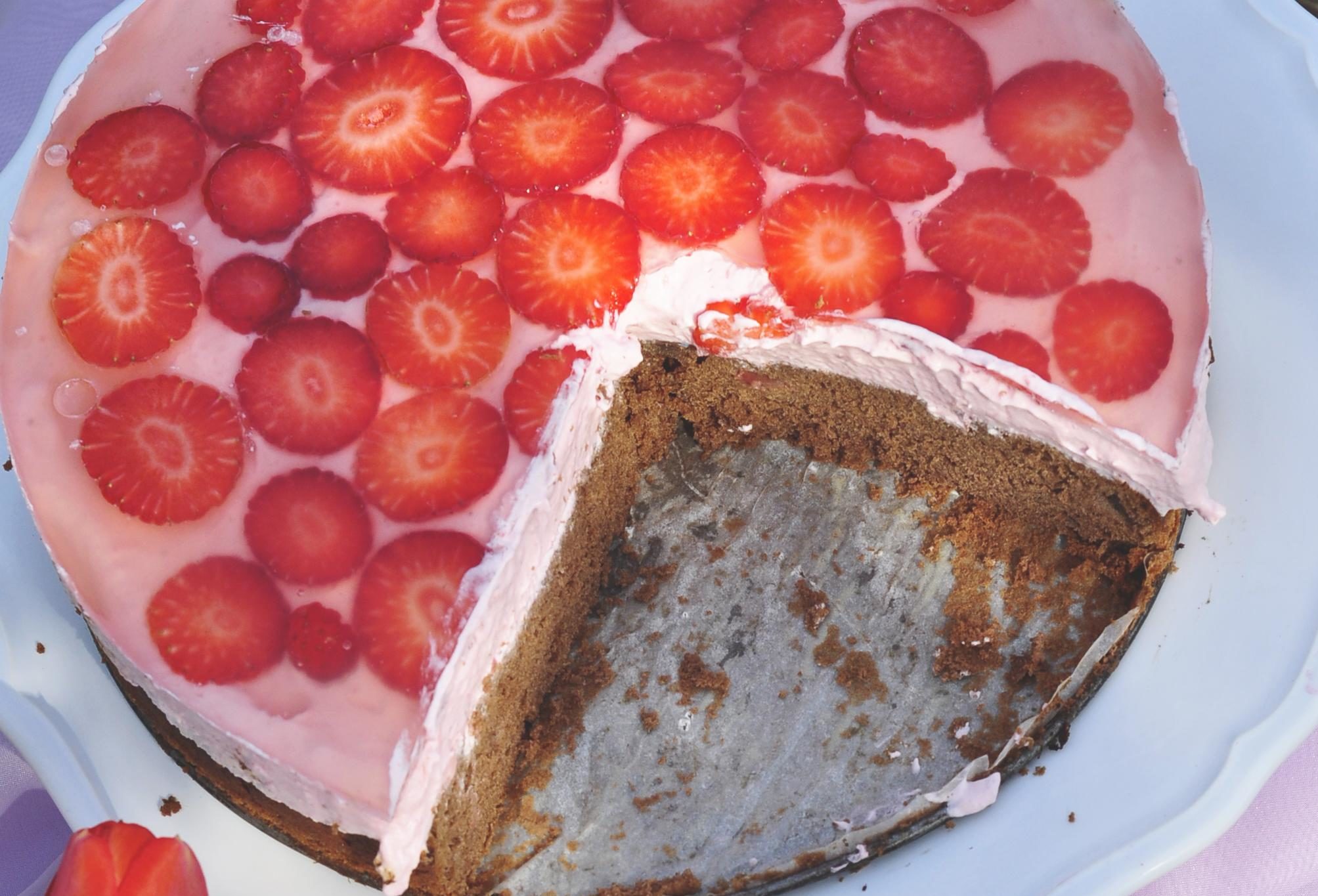 Az eperből vékony szeleteket vágunk és ráfektetjük a tortára, majd leöntjük a kihűlt zselével. Fogyasztás előtt hűtőszekrényben hagyjuk pihenni 2-3 órát.