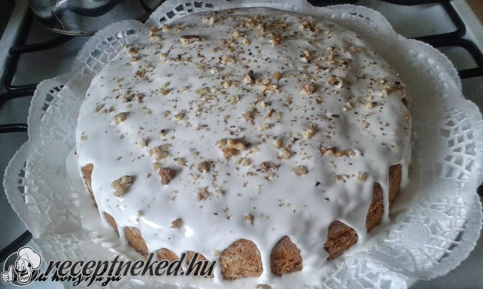 Elkészítjük hozzá a cukormázat. A tojásfehérjéhez hozzáadjuk a porcukrot és robotgéppel simára keverjük. Ekkor hozzáadjuk a rumot és a citromlevet is. Amennyiben túl híg lenne (kb méz sűrűségűnek kell lennie), tegyünk hozzá még porcukrot. Ezután leöntjük vele a tortánkat és durvára tört dióval megszórjuk.