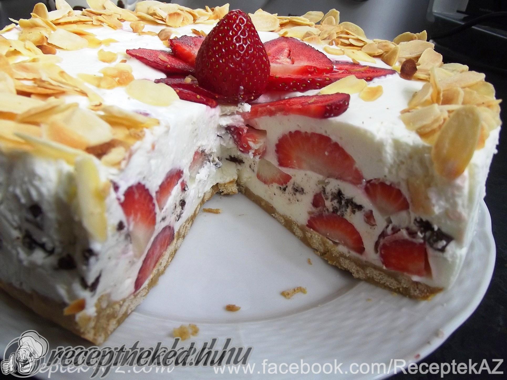 A tejszínt és a vaníliás cukrot kemény habbá verjük. A krémsajtot, édesítőszert és a citrom levét összemixeljük, hozzáadjuk a túrót és simává keverjük. Óvatosan összekeverjük a felvert tejszínhabbal. A forró vízben feloldjuk a zselatint, hozzáadunk 1-2 evőkanál krémet és simává keverjük. A feloldott zselatint hozzáöntjük a többi krémhez és mixerrel alaposan átkeverjük. Hozzáadjuk a megtisztított és negyedekre vágott epret és fakanállal alaposan átkeverjük. Ráöntjük a kekszes alapra. A tetejére pár szem epret és megpirított mandulapelyhet rakunk. A tortát pár órára a hűtőbe rakjuk majd tálaljuk.
