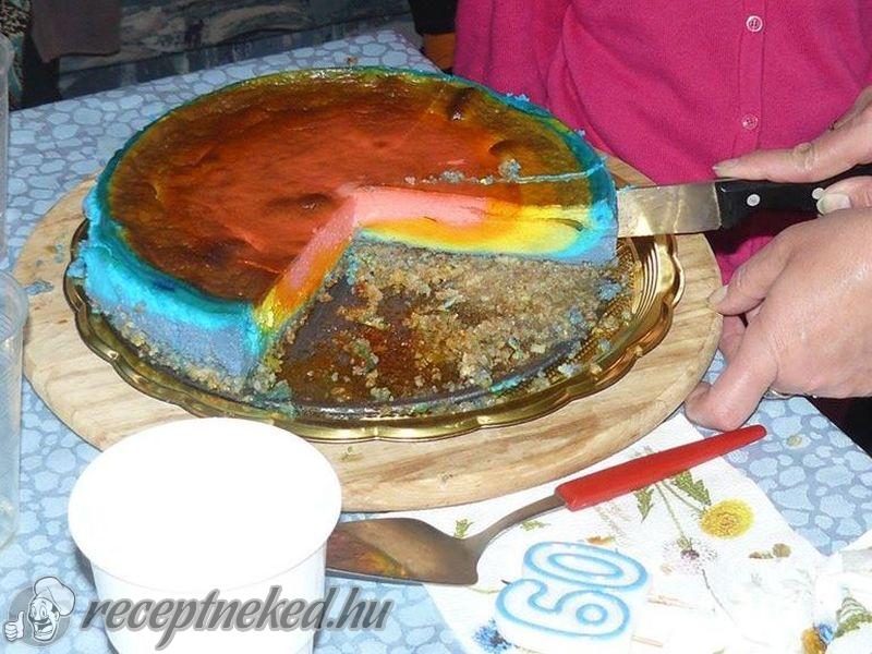 Színezzük meg ételfestékkel a krémeket. Tegyük az első színt az alapra úgy, hogy köröket formázva csurgassuk a formába. Így járunk el a többi színnel is.