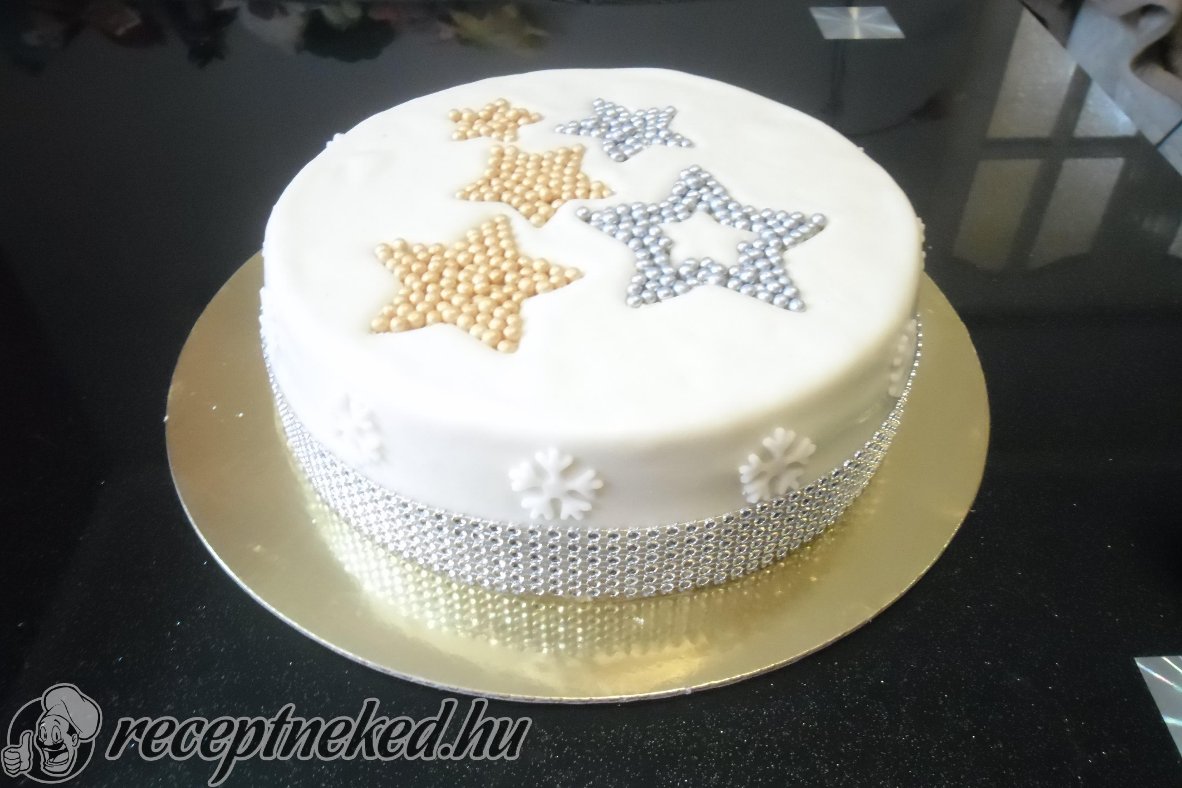 A tejporos bevonatot kinyújtjuk és egy nyújtófa segítségével a tortára helyezzük. Kezünkkel elsimítjuk előbb a torta tetején majd az oldalán, a felesleget levágjuk és ebből készíthetünk díszeket. Ízlés szerint díszítjük, én csillag kiszúró segítségével készítettem a mintát és cukorgyöngyöket használtam.