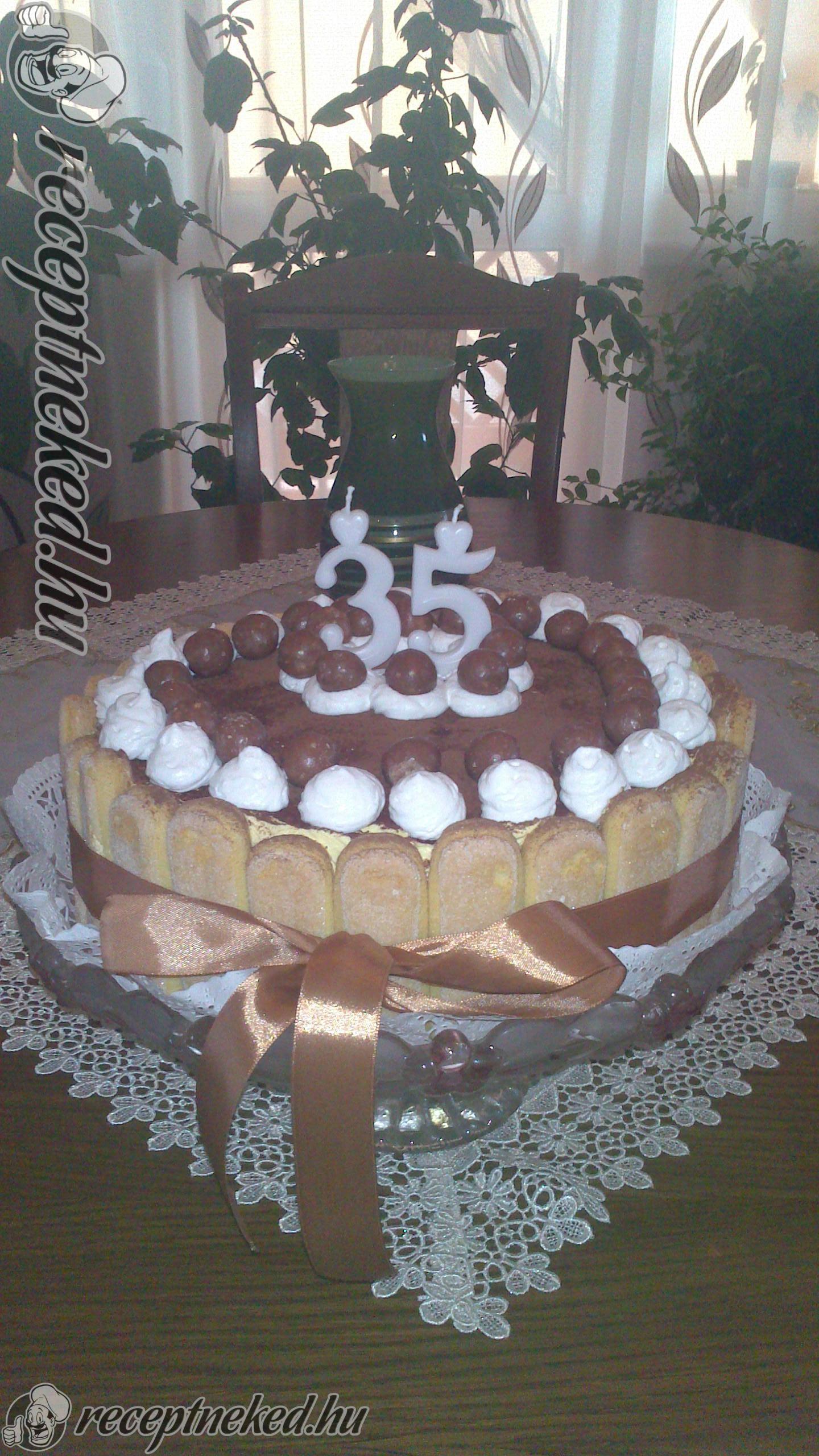 Az egészet bevonom a maradék krémmel, majd az oldalát babapiskótával rakom körbe. Szalaggal átkötöm a babapiskótát, a tetejét tejszínhabbal díszítem, amire még csokoládés gabonagolyót is teszek.