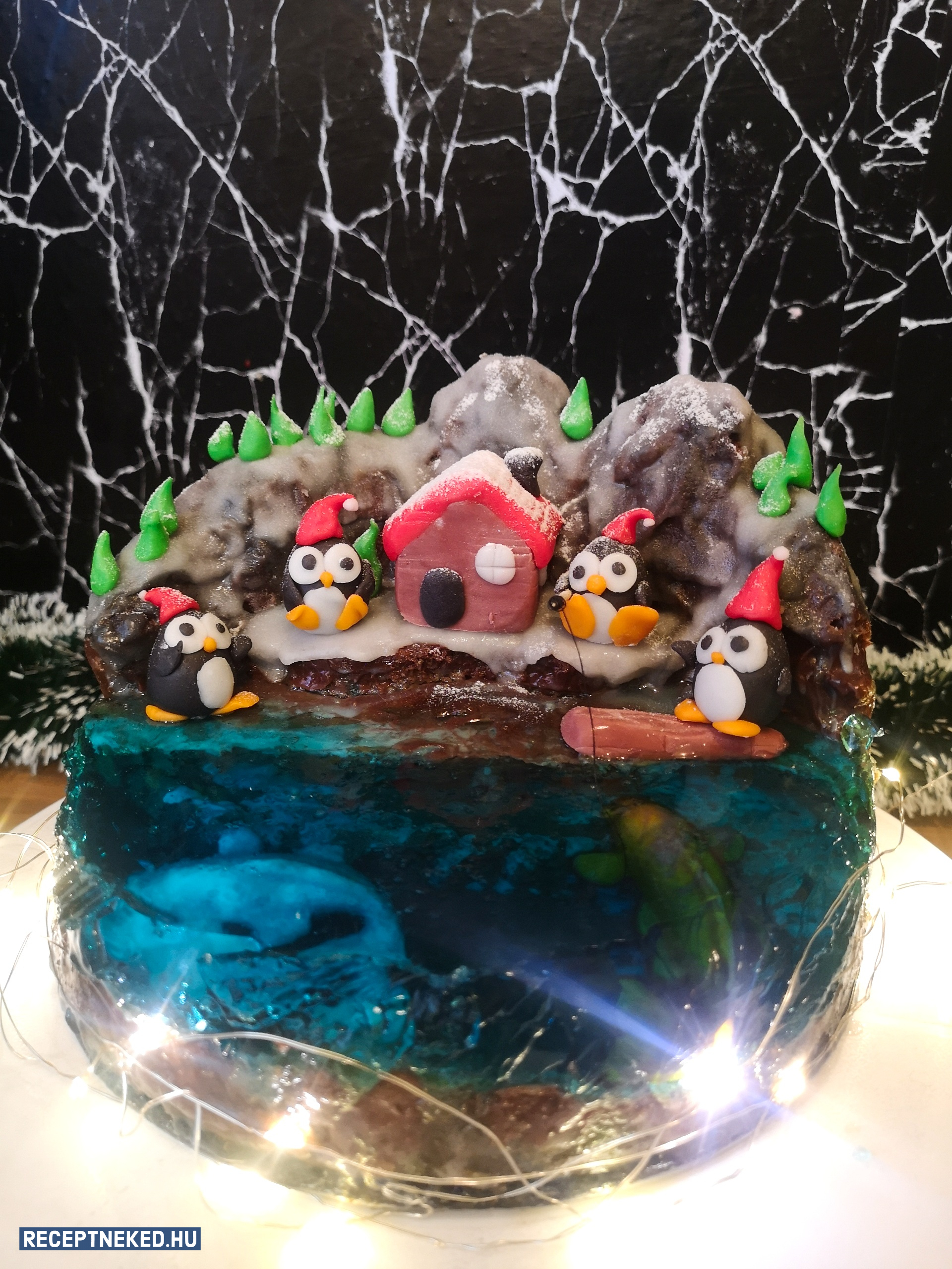 A folpackot lehúzzuk a zselatinról, a hegyeinken elhelyezzük a fenyőcskéket, a hegylábnál a házikót és a pingvineket, szárazföldünket pedig jól megintjük porcukorral a havas hatásért. Fogyasztásig hűtőben tároljuk.