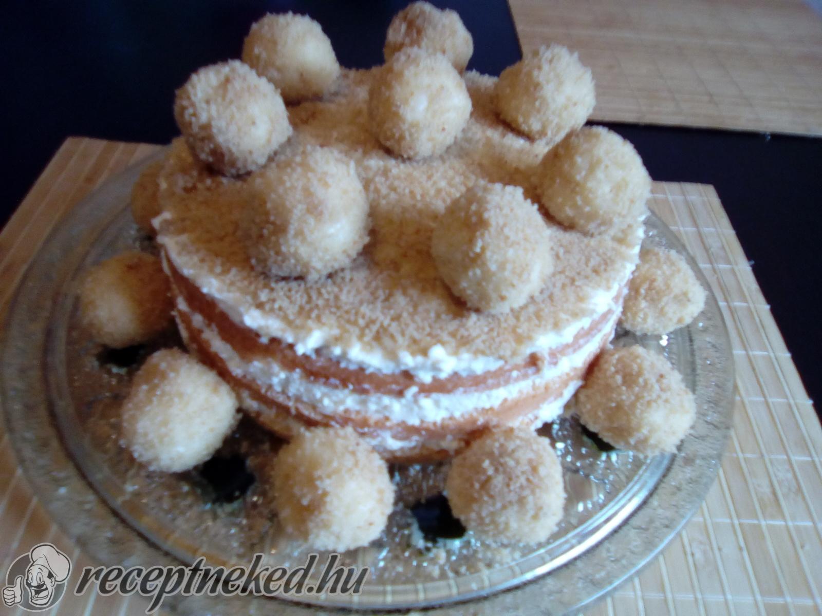 Ezután kivesszük a formából, a tetejét megszórjuk a félretett zsemlemorzsával és a mini gombócokkal díszítjük.