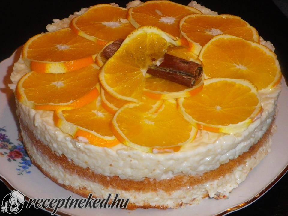 Amikor minden kihűlt a piskótát félbe vágom és a sütőformában rétegezem. Alulra kerül piskóta utána rizs megint piskóta újra rizs. A tetejét naranccsal díszítettem.